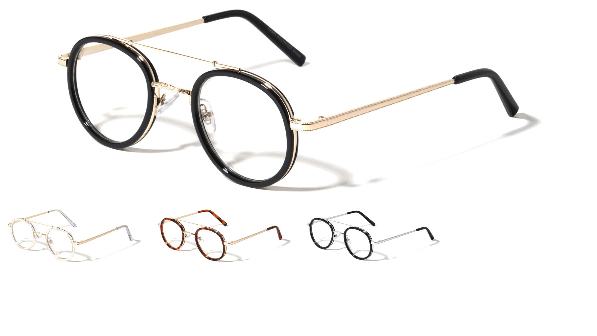 Clear lenses aviators featuring metal rounded frames. Shiny metal finish with plastic tips. Imported.