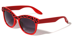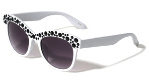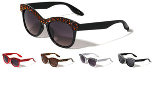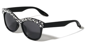Cat eye sunglasses that feature rhinestones at the top of the plastic frames for a fashionable, on trend look. Standard smoked lenses provide 100% UV protection.  Rhinestone design UV400, UVA...