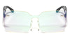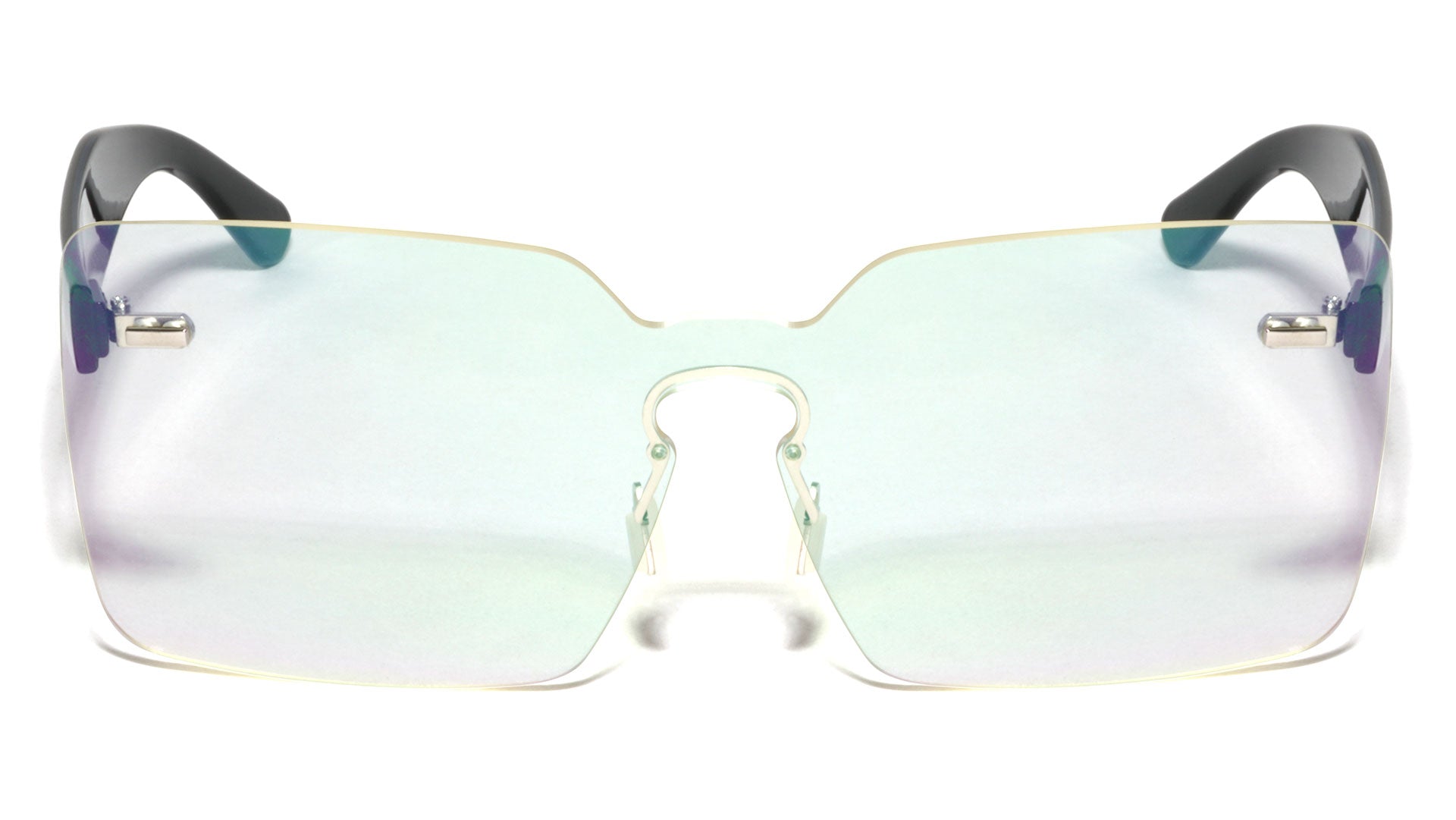 Plastic one piece glasses featuring clear lens in a rimless style. Shiny plastic finish. Imported.