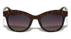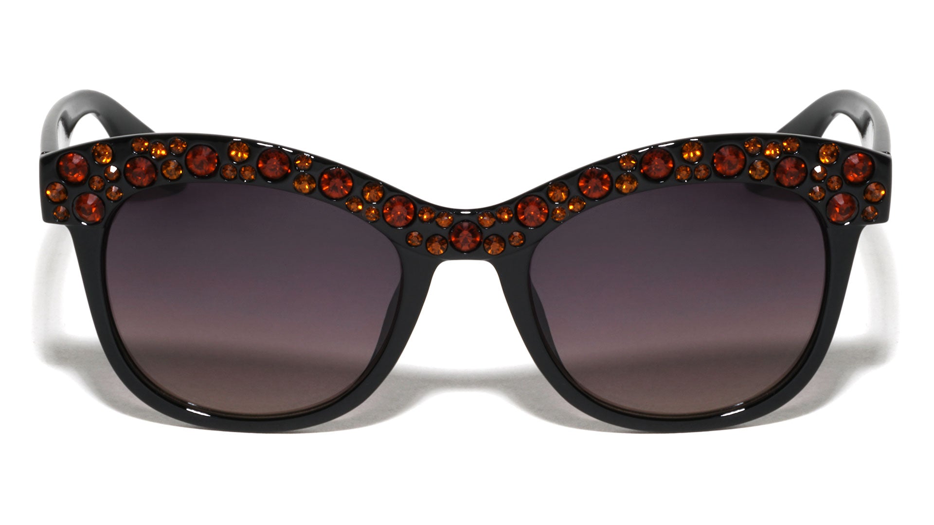 Cat eye sunglasses that feature rhinestones at the top of the plastic frames for a fashionable, on trend look. Standard smoked lenses provide 100% UV protection.